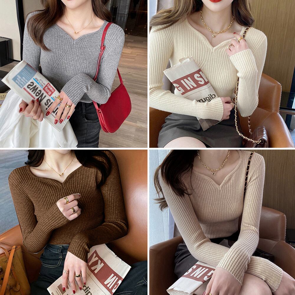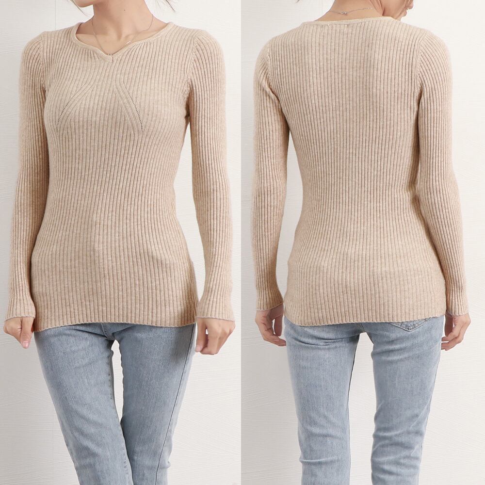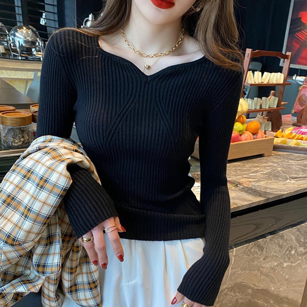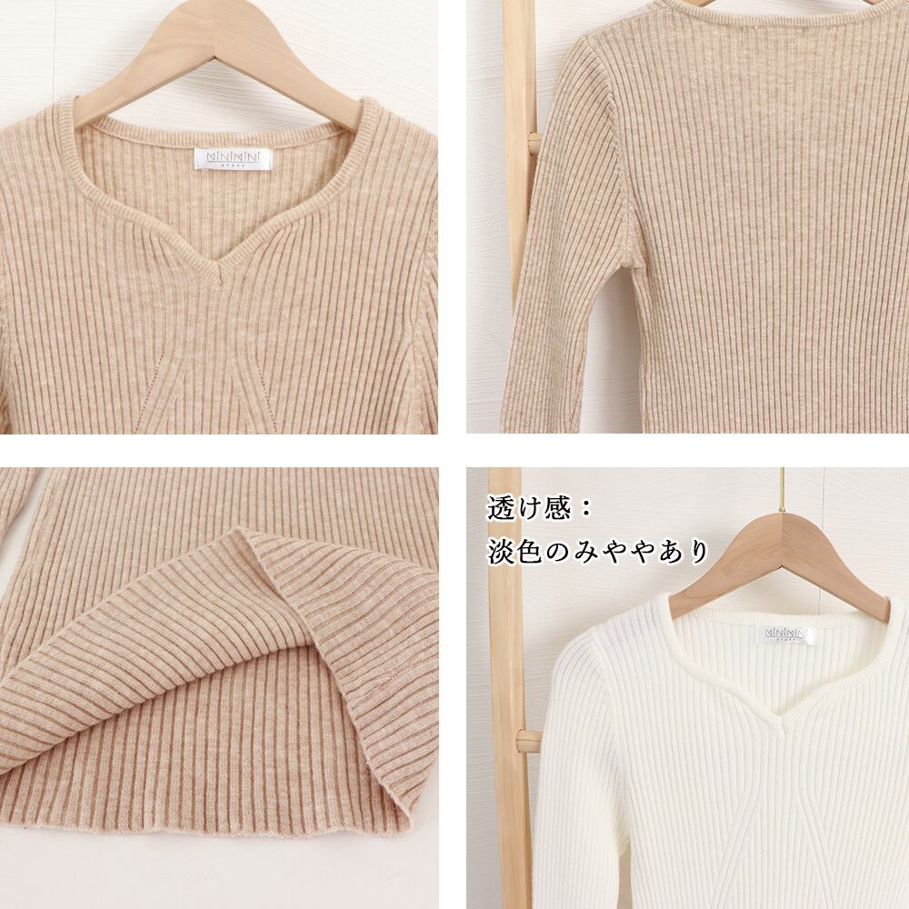 ハートネックで首元がすっきり綺麗に見える長袖タイトニットトップス